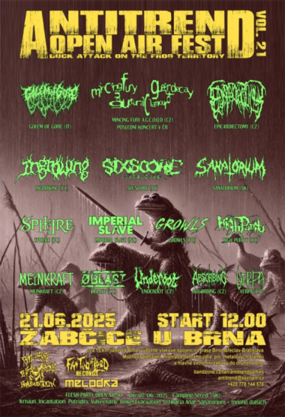 Festivalová sezóna se nám začíná pořádně rozjíždět a my jsme tu od toho, abychom našli ten nejlepší pro vás. Pokud chcete zažít nějakou pořádnou divočárnu, můžete si 21. června zaskočit do Žabčic u Brna. Tam se totiž bude pořádat death/grindová veselice ANTITREND open air festival. Na něm vystoupí celkem 15 kapel z celého světa.