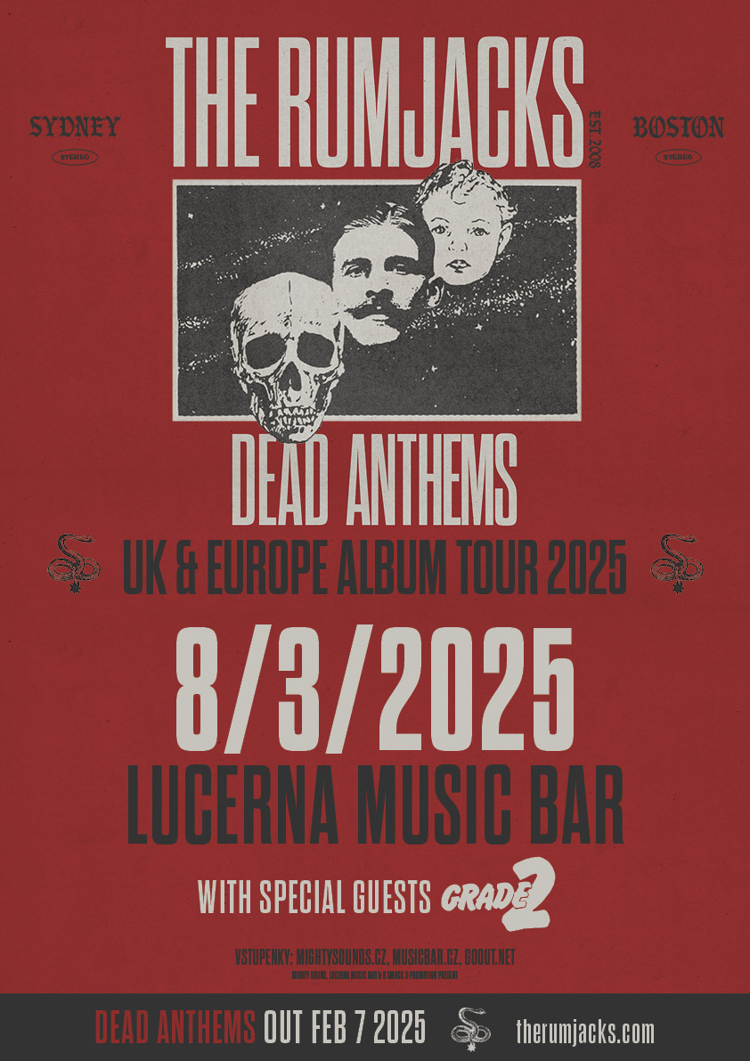 Celtic-punková parta THE RUMJACKS se vrací do Prahy! Po vyprodaném Futuru a fantastickém letním vystoupení na festivalu Mighty Sounds míří do Lucerna Music Baru. 8. března sem přivezou svou novou desku „Dead Anthems“. Ta vyjde 7. února a slibuje další nálož nekompromisního melodického punku s vlivy irského folku. Spolu s THE RUMJACKS vystoupí také anglické street-punkové trio GRADE 2, které jde ve šlépějích legendárních COCK SPARRER, ale přimíchává do své muziky syrový punk ala RANCID. Tohle si nemůžete nechat ujít!