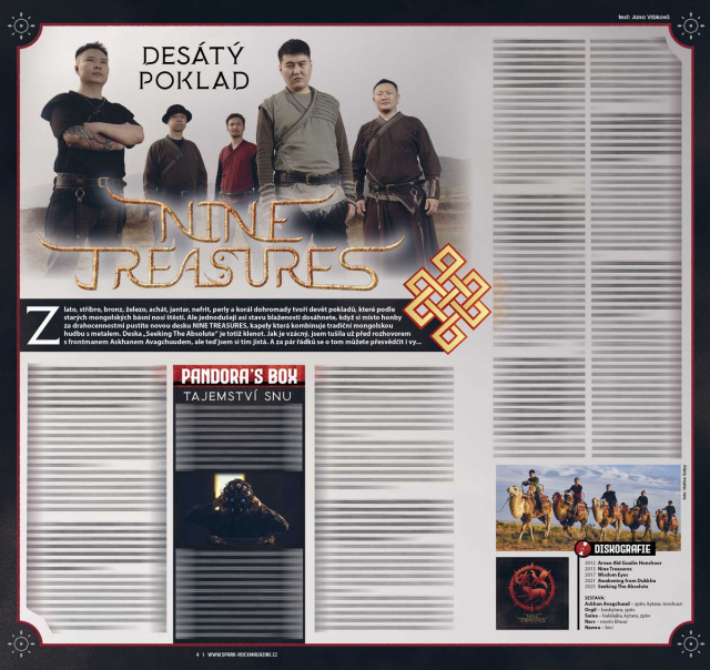 Zlato, stříbro, bronz, železo, achát, jantar, nefrit, perly a korál dohromady tvoří devět pokladů, které podle starých mongolských básní nosí štěstí. Ale jednodušeji asi stavu blaženosti dosáhnete, když si místo honby za drahocennostmi pustíte novou desku NINE TREASURES, kapely která kombinuje tradiční mongolskou hudbu s metalem.