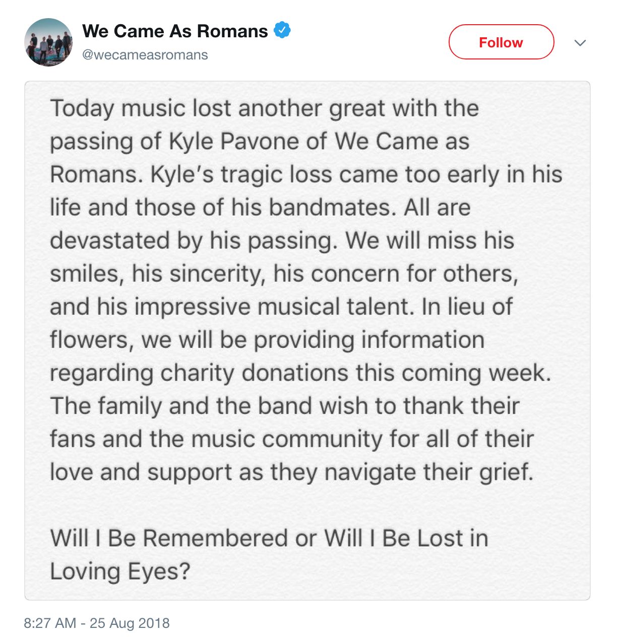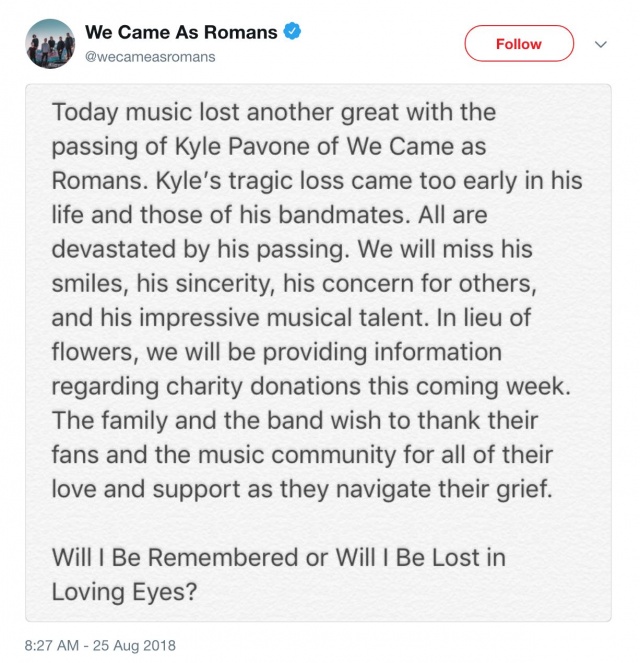 WE CAME AS ROMANS nejprve umístili na sociální sítě prohlášení, ve kterém zdrceně informují, že Kyle zemřel. Příčina smrti nebyla specifikována.