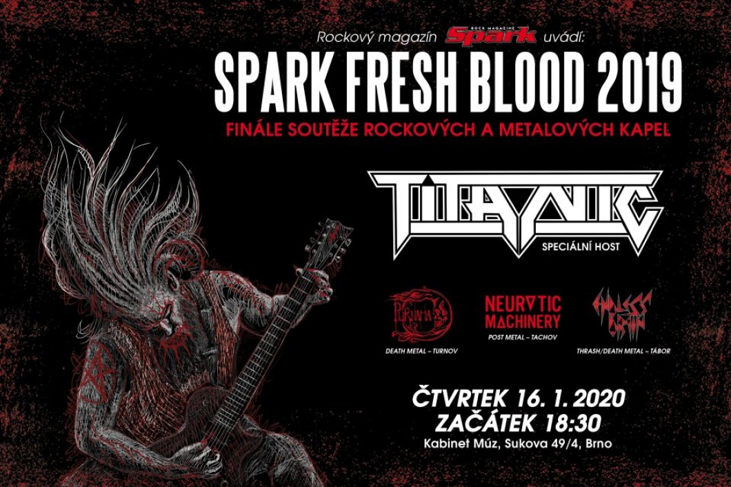 Talentová soutěž českých a slovenských rockových a metalových kapel Spark Fresh Blood 2019 dospěla do svého finále. Vítěze určí finálový kocenrt 16. ledna 2020 v brněnském klubu Kabinet Múz. Jako speciální host večera vystoupí místní legenda TITANIC.