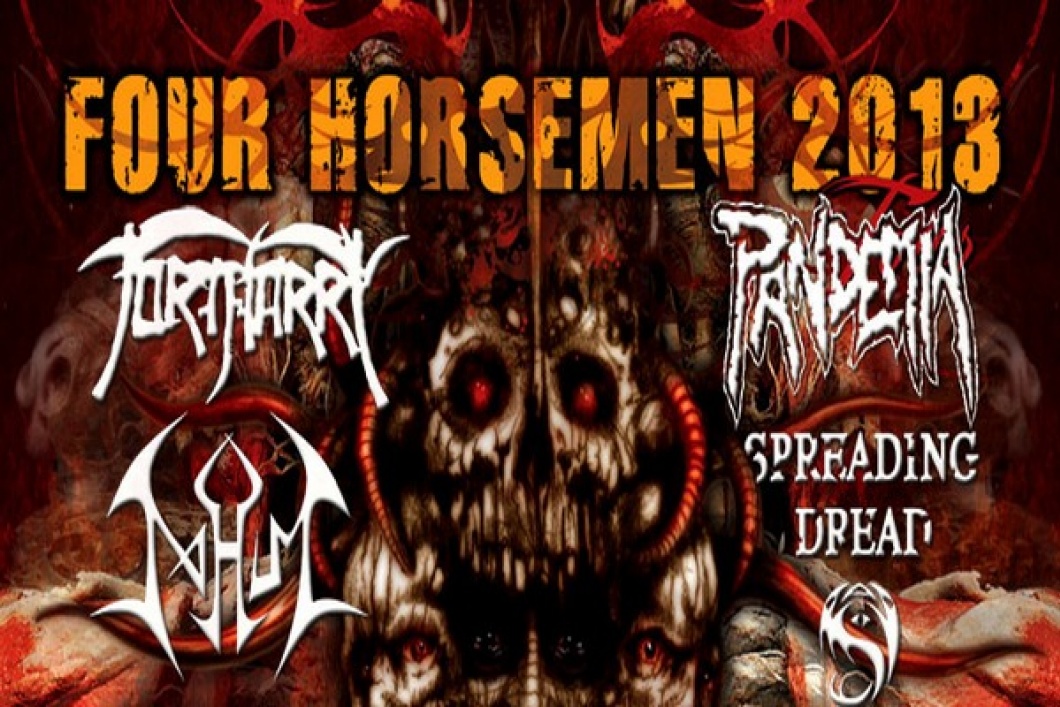 Začátkem května vyjedou společně na republikové turné čtyři jezdci apokalypsy. Pod příznačným názvem Four Horsemen Tour 2013 vyráží dobýt postupně Třinec, Brno, Prahu a Plzeň TORTHARRY, PANDEMIA, NAHUM a SPREADING DREAD. První dvě deathmetalové hvězdy naší scény netřeba dlouze představovat. Stovky koncertů po celé Evropě a dalších kontinentech i úspěchy studiových nahrávek mluví za vše a slibují pořádnou nálož. Další dvě kapely jsou dravé štiky v tuzemském rybníku; každá se způsobem sobě vlastním pohybuje na hraně death a thrash metalu. Obě kapely vydaly v roce 2012 svá debutová alba, která se dočkala velice kladných ohlasů posluchačů i kritiky. Tento koncertní zážitek umocní také support, kterými jsou v Třinci polští ISURUS (brutal/technical death metal), v Brně INNERVATE (metalcore/thrash) a v Plzni EINE KLEINE BANG BANG (metal/violence). Těšte se na pořádnou porci drtíci muziky...