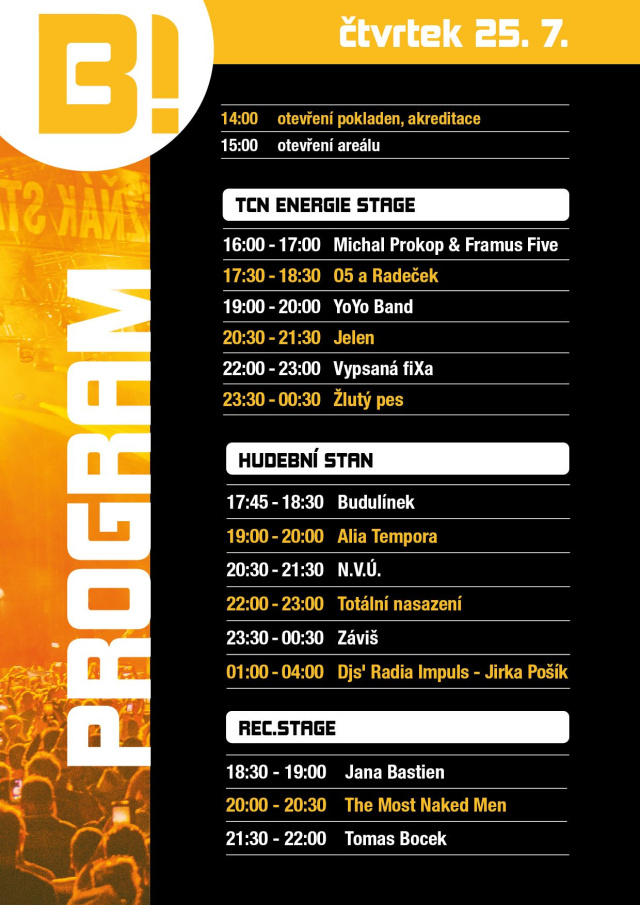 Návštěvníci, kteří ani po posledním koncertě nebudou dostatečně nabažení hudbou, se mohou (i v pátek a v sobotu) protančit tříhodinovým DJským setem Rádia Impuls, které na Benátské oslaví svých 25 let v českém éteru.