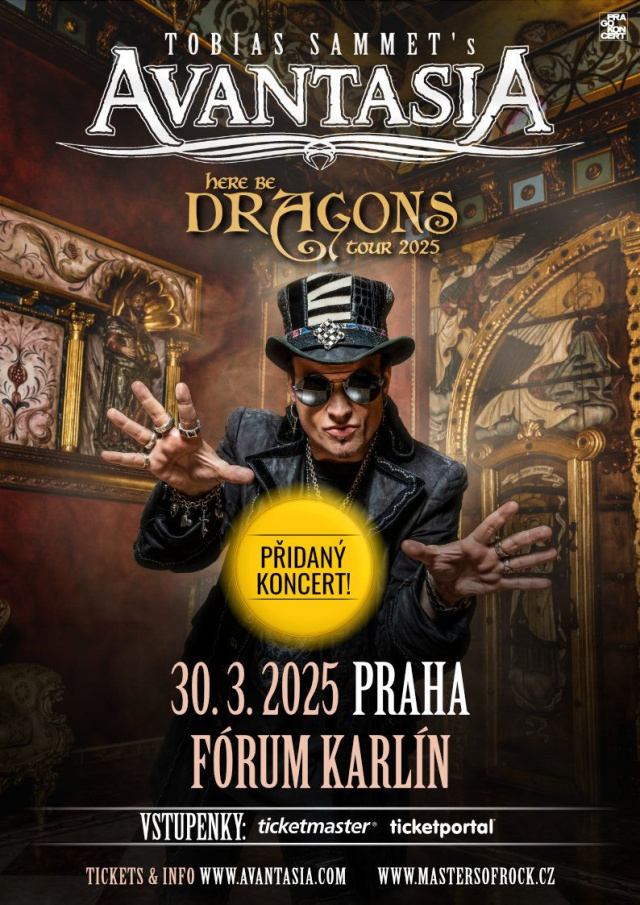Metalová opera Tobiase Sammeta zakotví koncem března na dva dny v Praze, aby představila své nové album „Here Be Dragons“ na dvou fenomenálních show plných metalových melodií, fantasy příběhů, zábavy, ale i tajemna. Novou působivou výpravu a strhující výkony devíti hostujících zpěváků si nemůže nechat ujít žádný fanoušek!