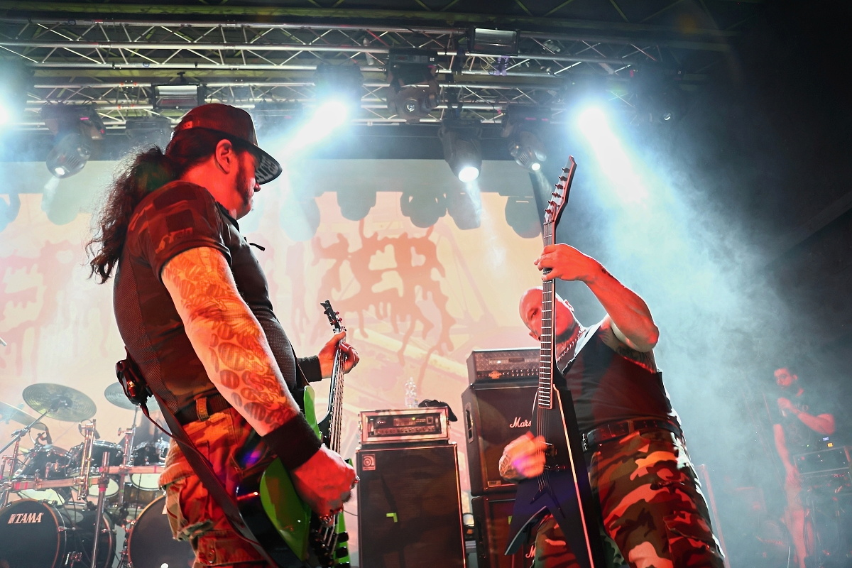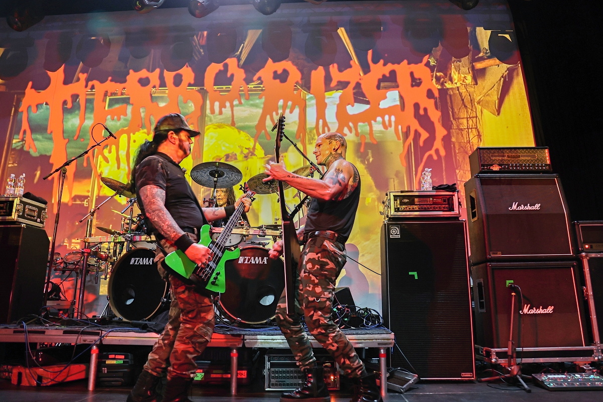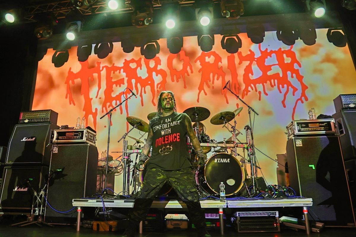 To třetí borci jsou už jasně zavedení na extrémní scéně. Řečtí thrashmetaloví matadoři SUICIDAL ANGELS rozjeli naprosto agresivní show s nadupanými riffy, kdy neponechali nic náhodě. Ale to už všechno směřovalo k prvním hvězdám, kterými nebyl nikdo jiný než slovutní králové extrémního death grindu – TERRORIZER. Sestava byla více než skvostná. Nelehkého vokálního partu se ujal Brian Werner, zatímco šest strun neskutečně zběsile drhnul Richie Brown. Oba se k legendě přidali v roce 2023. Když už mluvím o legendách, za bicí artilerií nemohl sedět nikdo jiný než naprostý šílenec Paul „Commandante“ Sandoval a čtyři struny nemohl znásilňovat nikdo jiný než David Vincent. K tomu se ani nedá nic říct. TERRORIZER se s ničím nepárali a nabušili do fanoušků celé zásadní debutové album „World Downfall“. Je zajímavostí, že když poprvé začalo demolovat svět v roce 1989, Brianovi bylo devět let. Dokonale extrémní, brutální show si užíval každý a někdo i určitě více, kdy si právě Brian na pódium vytáhnul jedenáctiletou Verču, aby se s ní posléze vrhnul do davu. Kapela jela neskutečně na plný plyn a celou show dokreslovalo promítání hodně povedeně zpracovaných nihilistických a drásajících podkresů. Album „World Downfall“ je naprostou klasikou, kterou doplnili i pár skladbami z pozdějších alb, jako třeba „Crematorium“, „Nightmare“, „Hordes of Zombies“ či „State of Mind“. Hodina naprostého masakru a šílenství utekla neskutečně rychle. TERRORIZER jsou absolutní legendou svého druhu.