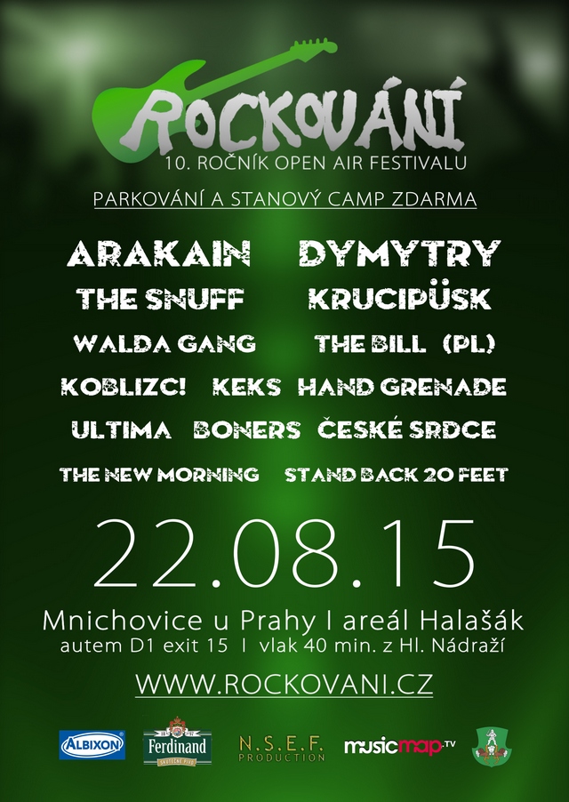 V pomalu končící letní festivalové sezoně tu pro vás máme akutní pozvánku už na tuhle sobotu, 22. srpna! Na jubilejní desátý ročník rockového festivalu Rockování konaného v Mnichovicích u Prahy. Na dvou pódiích se můžete těšit na šestnáct domácích souborů a jeden z Polska. Mezi největší taháky přitom nepochybně patří ARAKAIN, KRUCIPÜSK, DYMYTRY, WALDA GANG či talentovaní THE SNUFF. Na místě za 390 Kč, respektive 340 Kč.