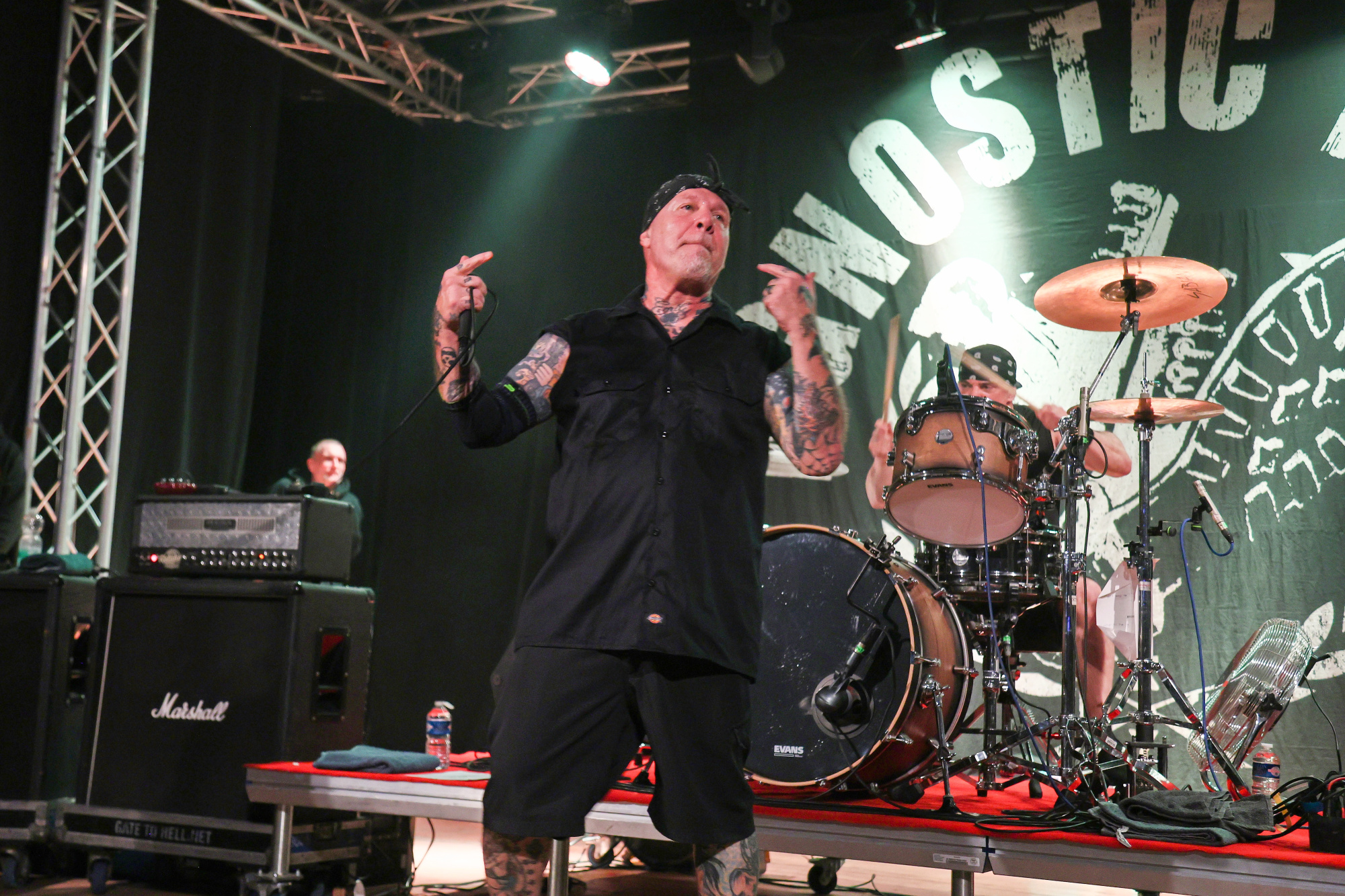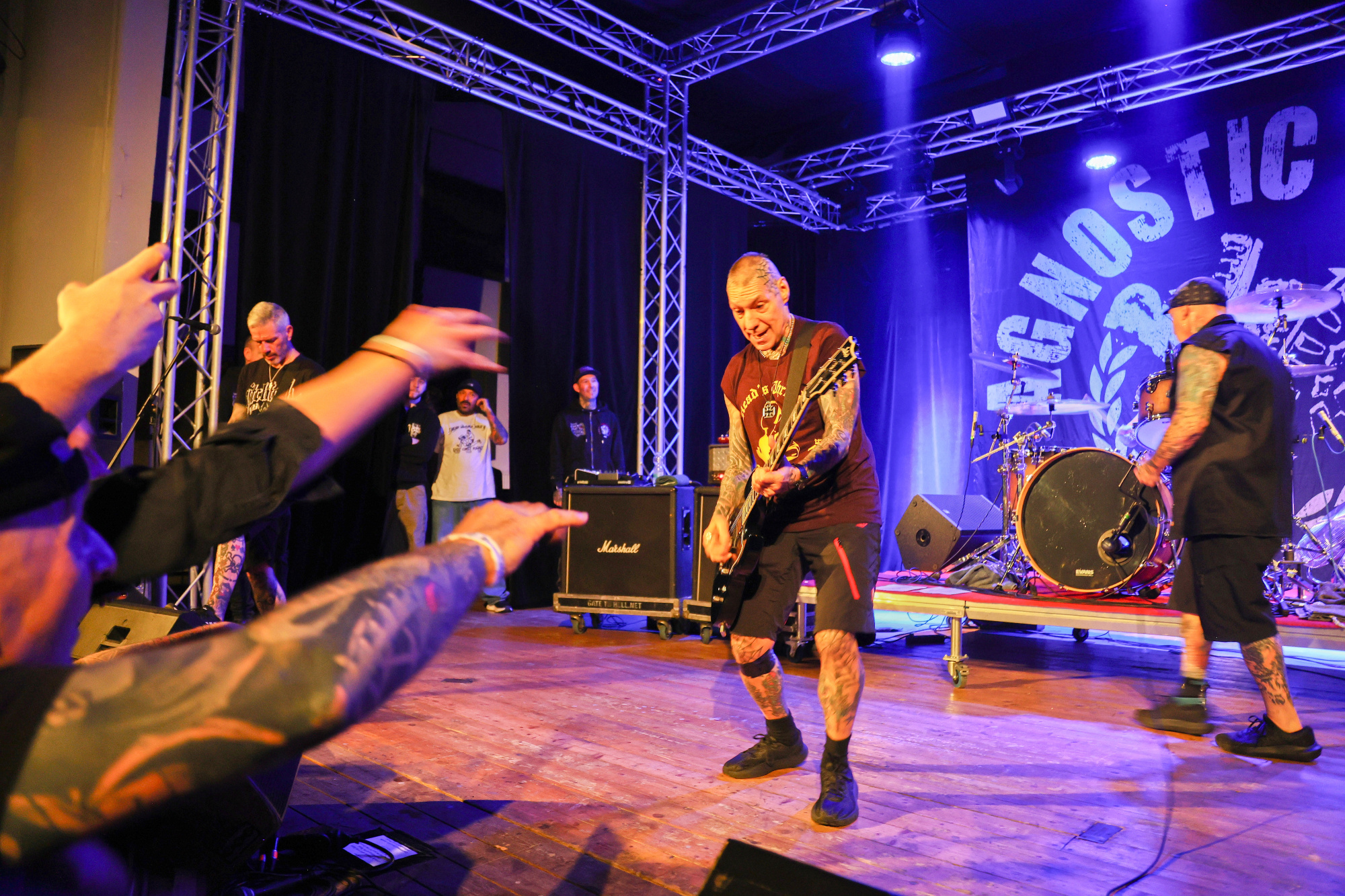 Zakladatel kapely, kytarista Vinnie Stigma, se dokonale bavil. Hlavní kytaru drží na pódiu už delší dobu Craig Silverman, a tak Stigma rozjel svou show. Někdy v postojích přísný, ale hlavně usměvavý. Skákal do lidí, nechal se nosit, šel do pitu s kytarou. Loni mu bylo sedmdesát. Po koncertu se již tradičně vypravil do baru, kde podepisoval, nechal se fotit, dal si pivo, panáka, prostě týpek z lidu. Stigma for President! Koncert měl neskutečné grády, někteří fans měli v očích slzy. Věk je neúprosný, kdo ví, jak dlouho jim bude sloužit zdraví. Každopádně králové tohoto stylu se předvedli v tom nejlepším světle. Klobouček za všechny fans. Tohle je ulice, tohle je hardcore, tohle jsou a budou AGNOSTIC FRONT. Příště nashledanou!