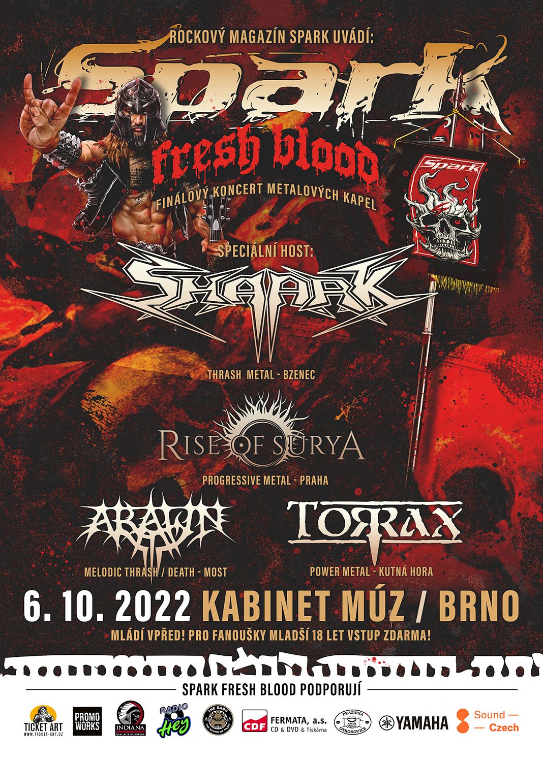 Ve finále Spark Fresh Blood se utkají tři nadějné spolky: mostečtí thrasheři ARAWN, powermetalisté TORRAX z Kutné Hory a progresivní Pražáci RISE OF SURYA. Už tento týden, ve čtvrtek 6. října v centru Brna vypukne metalový svátek, který v souboji na pódiu Kabinetu Múz určí vítěze, jenž si odnese např. smlouvu pro vydání alba u Smile Music!
