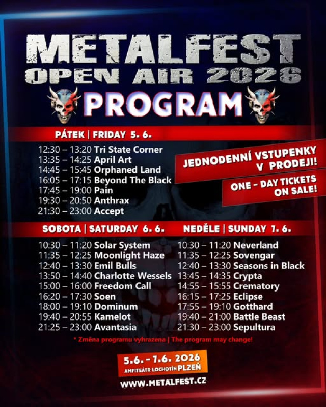 Plzeňský mezinárodní metalový festival Metalfest zveřejnil přesný harmonogram svého již 15. ročníku. Naplánujte si svůj červnový pobyt v Plzni co nejdříve a do detailů, abyste stihli vše, co stihnout chcete! Metalové léto 2026 totiž startuje v amfiteátru Lochotín už 3. června samostatným megakoncertem SABATON. Metalfest pak na stejném místě startuje v pátek, 5. června a do neděle 7. června tady bude parádně živo!