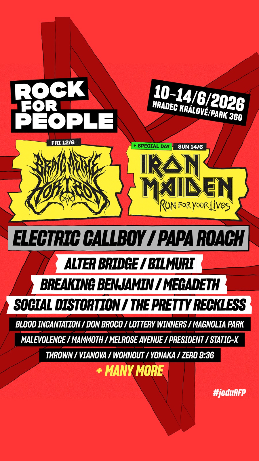Pořadatelé oznámili prodloužené datum festivalu z původních třech dnů na termín 10.-14. června 2026 a kromě prvních dvou headlinerů naservírovali balíček dalších 21 kapel, které příští léto zavítají do hradeckého Parku 360. „Po až neuvěřitelně vydařeném letošním narozeninovém 30. ročníku festivalu v čele s LINKIN PARK jsem tak trochu tušil, že nebude vůbec jednoduché zachovat stejnou úroveň lineupu pro ročníky příští. Už teď ale mohu s klidným svědomím potvrdit, že následující rok bude opět famózní,” říká zakladatel festivalu Rock for People Michal Thomes, a dodává: „Rock for People 2026 se ponese znovu ve znamení plnění některých z mých snů v čele s IRON MAIDEN, kteří svojí hudbou formovali několik generací včetně mě.”