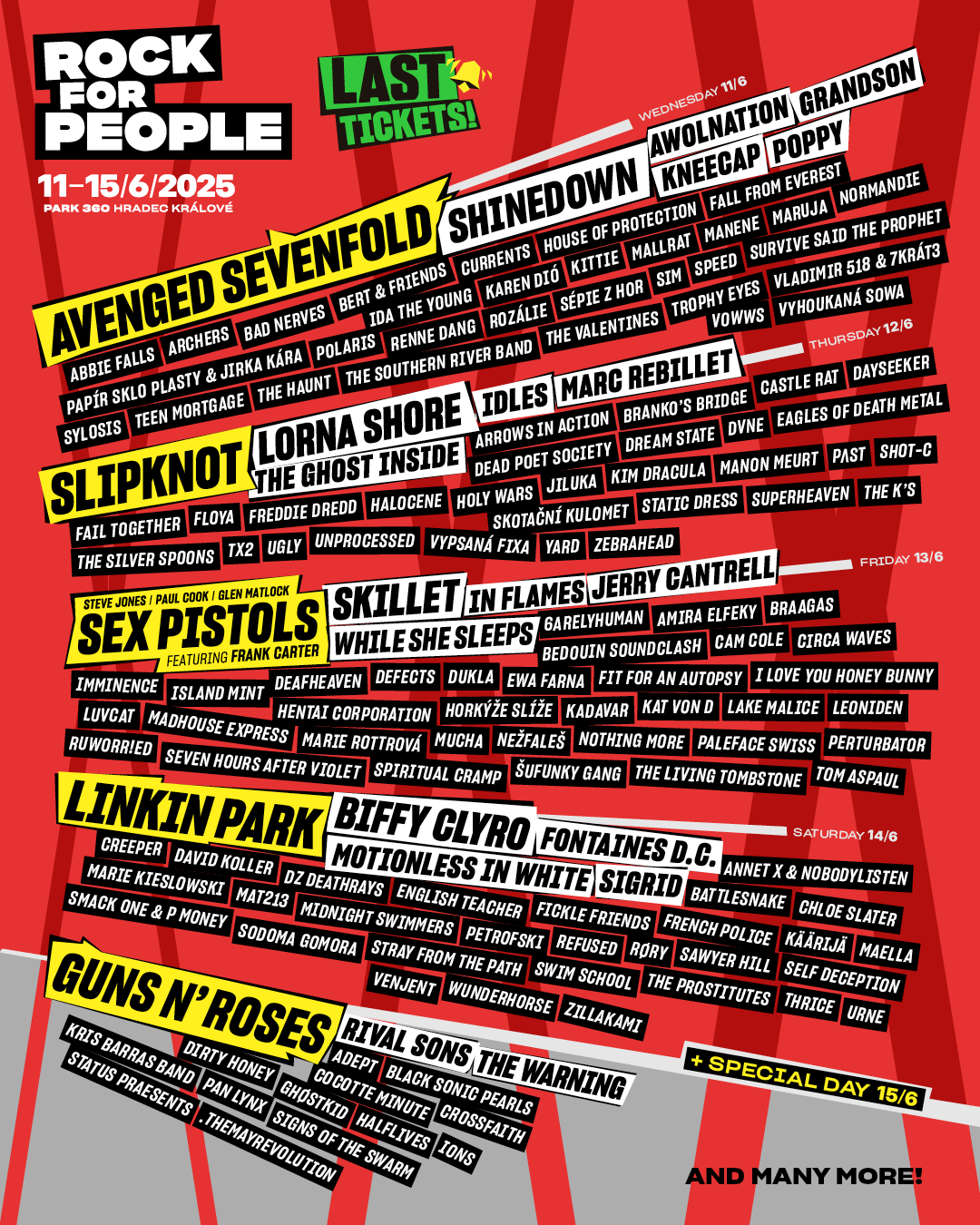 Pořadatelé nyní oznámili 40 kapel z česko-slovenské scény, které doplnily hvězdy z celého světa v čele s LINKIN PARK, SLIPKNOT, SEX PISTOLS, AVENGED SEVENFOLD a GUNS N’ ROSES. „Z tuzemské scény u nás letos vystoupí například David Koller se speciálním setem, THE PROSTITUTES, Vladimir 518 společně se 7krát3 a již tradičně nesmí na festivalu chybět VYPSANÁ FIXA. Mladší publikum určitě potěší Smack One a P Money, Annet X a Nobodylisten nebo Mat213,” říká zakladatel festivalu Michal Thomes.