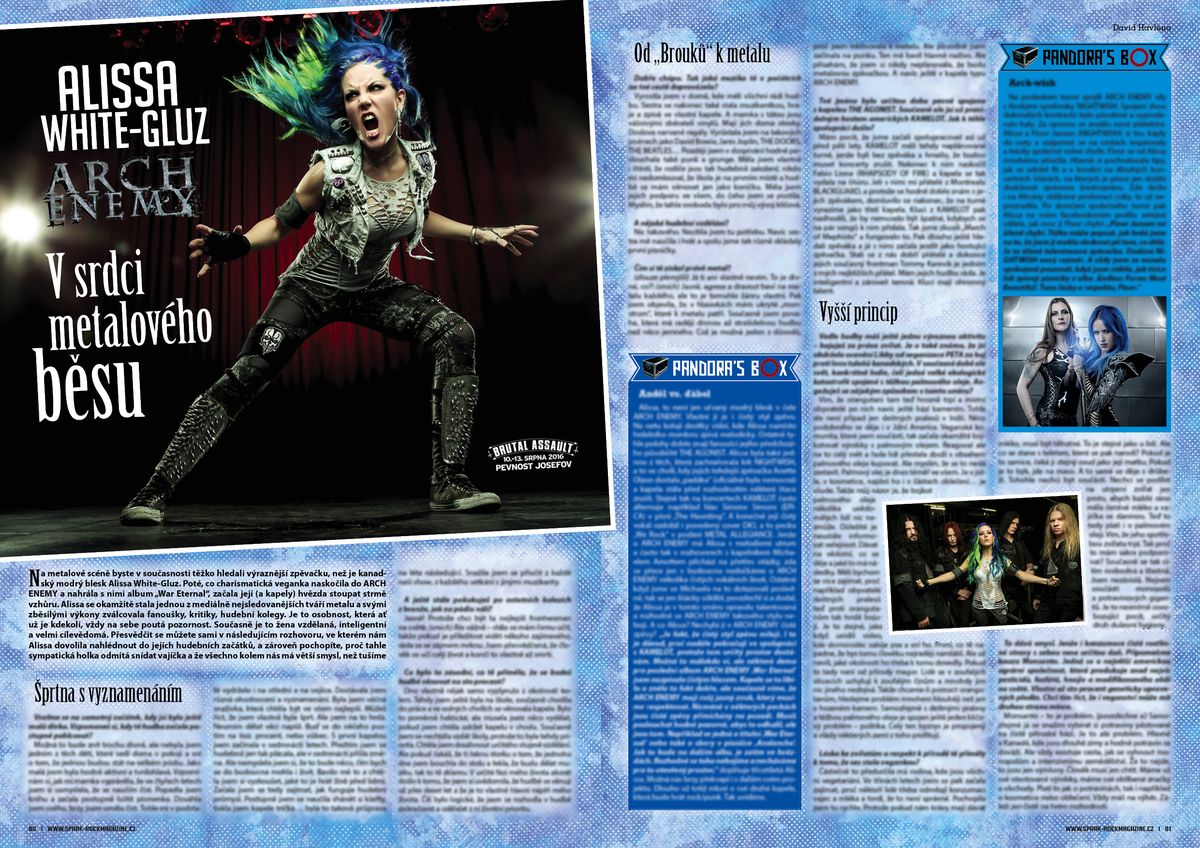 Už v pátek se festivalem BRUTAL ASSAULT prožene modrý blesk Alissa White-Gluz a společně s ní ARCH ENEMY. Zřejmě naposledy se kapela českým fanouškům předvede s programem k desce „War Eternal“. Jak totiž před týdnem ARCH ENEMY prohlásili, chystají live DVD a pro nadcházející album připravili už osm skladeb. Zřejmě tak i v nadcházejících letech švédští metalisté nehodlají polevit z brutálního tempa. Od příchodu Alissy kapela doslova válcuje pódia po celém světě. A právě s Alissou jsme se Spark TV probrali její začátky, hudební zázemí nebo její rozhodnutí oddat se metalu. Mrkněte.