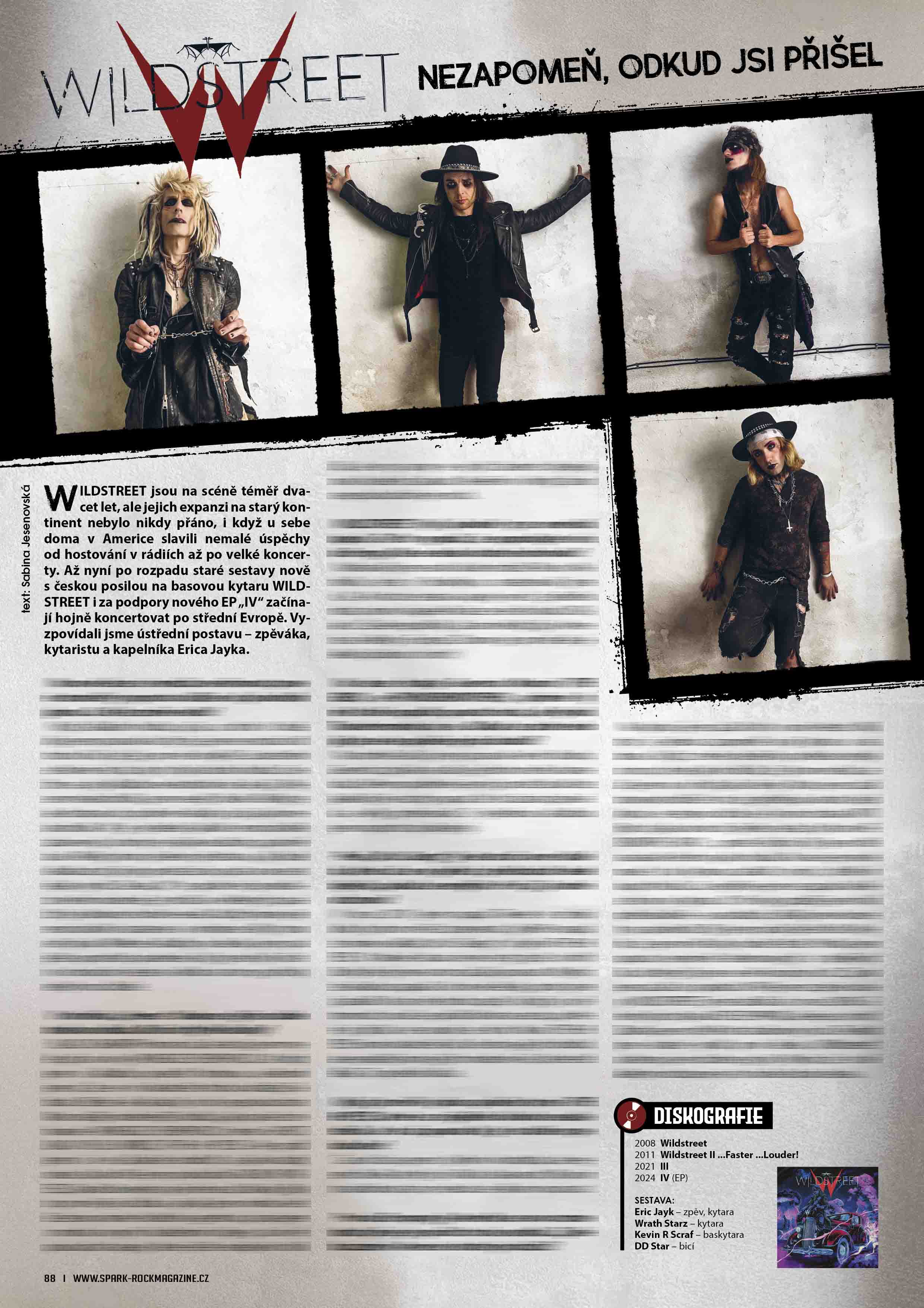 Američtí WILDSTREET jsou na scéně téměř dvacet let, ale jejich expanzi na starý kontinent nebylo nikdy přáno. Až nyní po rozpadu staré sestavy nově s českou posilou na basovou kytaru začínají na podporu nového EP „IV“ hojně koncertovat po střední Evropě. V nejnovějším čísle Sparku jsme vyzpovídali ústřední postavu – zpěváka Erica Jayka.