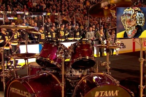 Finský brankář týmu Bruins Tukka Rusk odchytal v nejslavnější hokejové lize světa pětistý zápas. A jeho klub mu jako překvapení připravil přesnou repliku bicí soupravy Larse Ulricha.